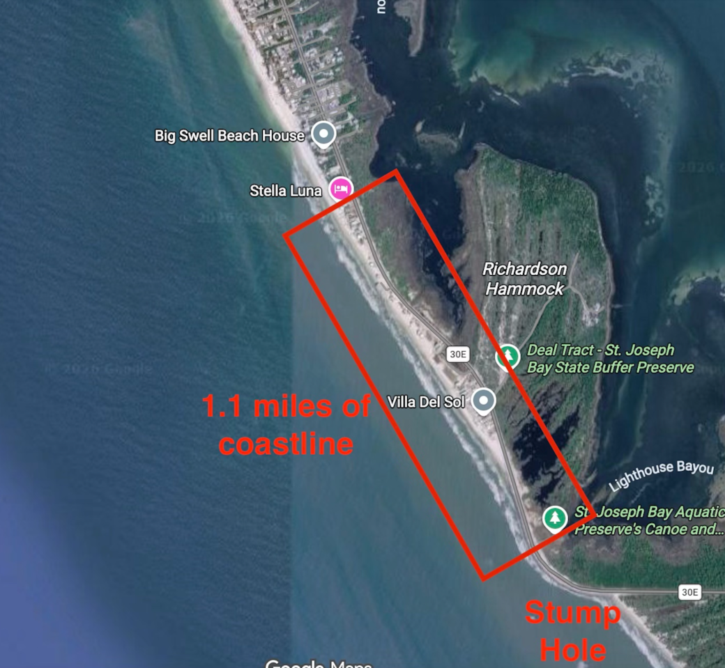 Gulf County will begin a beach nourishment and coastal structures project at the end of March 2026 along a stretch of shoreline starting near the Stump Hole (Rocks) and extending 1.1 miles to the North. The project includes adding sand to the beach and installing submerged breakwaters to help keep the sand in place for a longer period.